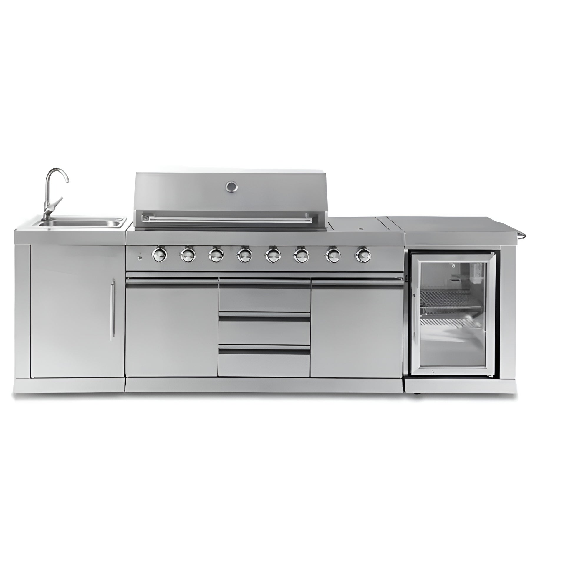 • Cabinet Storage: Weather-sealed drawers and compartments for cookware and accessories